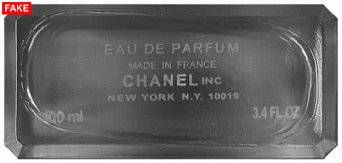 6. کف شیشه عطر کوکو مادمازل شنل تقلبی به ظرافت شیشه اصلی نبوده و از خطوط ناهمواری برخوردار است. همچنین خطوط قالب ریزی در شیشه تقلبی واضح است. همچنین عبارت CHANEL (مشابه عطر بلو شنل و کوکو شنل ) در نوع تقلبی تنها یکبار حک شده و همچنین نوشته های عطر اصل و تقلبی متفاوت است.