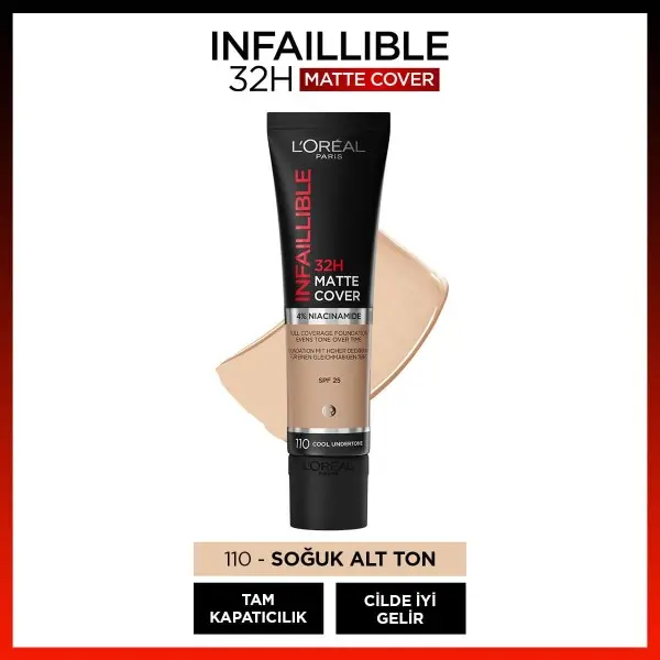 کرم پودر تیوپی لورال شماره 110 مدل INFAILLIBLE 32H MATTE COVER یک پوشش کامل آرایشی را ارائه داده و درخشندگی پوست را کنترل می کند. این محصول اکنون در تولید جدید خود دارای یک اثر یکسان کننده رنگ پوست نیز است. با فرمول حاوی 4% نیاسینامید، رنگ پوست را یکدست می کند و ظاهر عیوب پوست را پنهان می کند. علاوه بر این، به لطف فرمول جدید خود، تا 32 ساعت روی پوست دوام دارد. در هر زمان و هر مکان با پوشش مات کرم پودر INFAILLIBLE 32H MATTE COVER که برای پوست نیز مفید است و ظاهری مات ایجاد می کند، احساس سرزندگی داشته باشید. همچنین، این محصول حاوی ضد آفتاب با SPF 25 برای محافظت از پوست در برابر اشعه ماوراء بنفش بوده و یک محافظت کننده کامل آرایشی به حساب می آید.