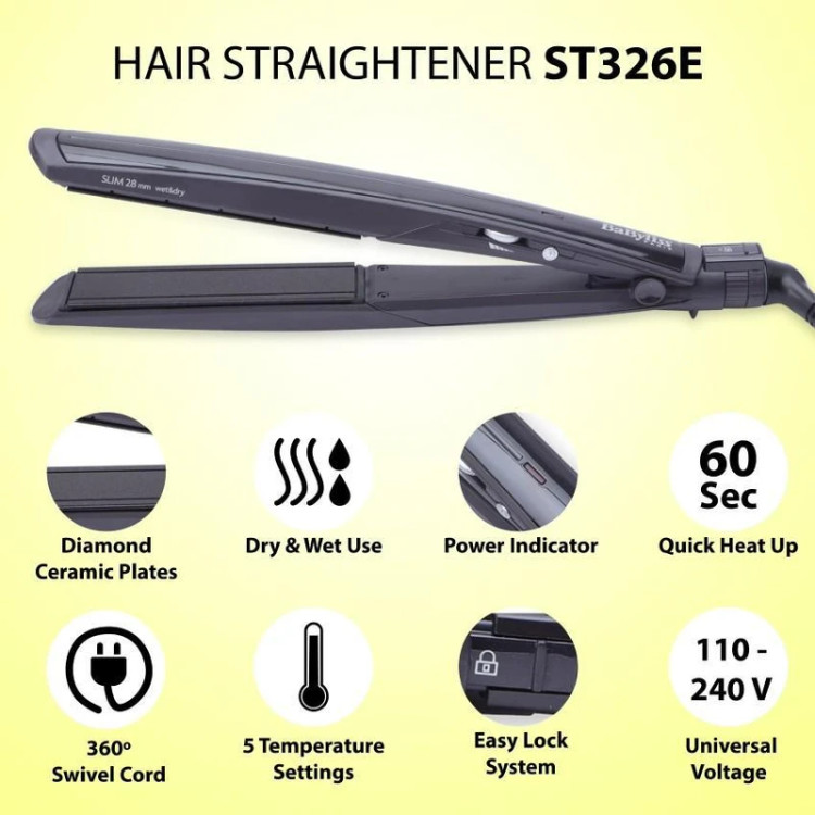 اتو موی بابلیس مدل ST326E با صفحاتی از جنس سرامیک الماسی اصطکاک روی سطح موی های شما را به حداقل می رساند و موهایی صاف و شلاقی در زمان بسیار کم فراهم می کند. به آسانی در زمان شما صرفه جویی می کند و از سلامت موها نیز محافظت می کند.